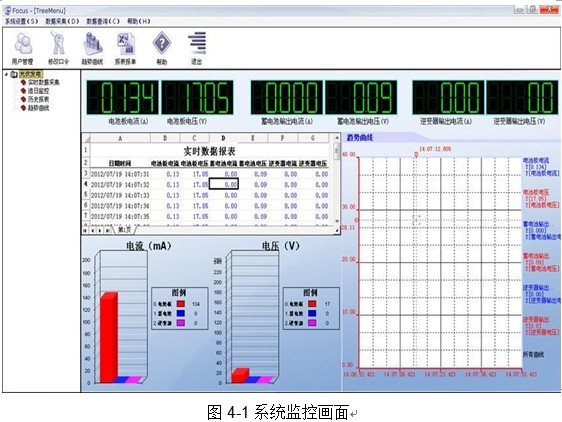 4.1監(jiān)控系統(tǒng):監(jiān)控系統(tǒng)主要完成顯示充電電壓、充電電流、功率、運行狀態(tài);顯示蓄電池電壓、蓄電池放電電流、負載電壓、負載電流各種參數(shù)保護、實時數(shù)據(jù)顯示與處理、對用戶提供權(quán)限管理、密碼登錄等。