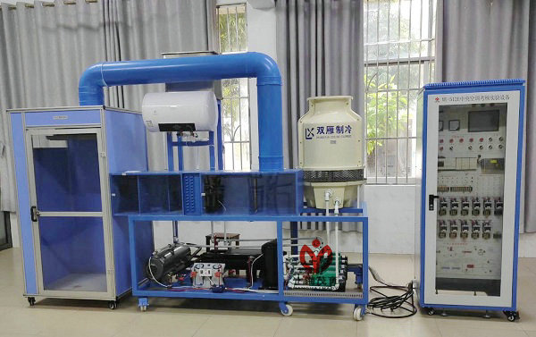 由一個(gè)模擬房間,和一個(gè)組合式風(fēng)柜組成。模擬房間采用30*30工業(yè)標(biāo)準(zhǔn)鋁型材和雙面烤漆木板結(jié)構(gòu),內(nèi)部裝有和真實(shí)空調(diào)末端同樣的風(fēng)機(jī)盤(pán)管,三級(jí)調(diào)速,由調(diào)整開(kāi)關(guān)用戶(hù)自由調(diào)。組合式風(fēng)柜系統(tǒng)由回風(fēng)口,新空氣混合風(fēng)口,送風(fēng)機(jī),中央空調(diào)蒸發(fā)器,管道,電磁閥組成。