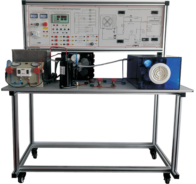 本裝置是采用直流式空氣處理系統(tǒng),并配置壓縮機、風(fēng)冷冷凝器、蒸發(fā)器、加濕器、電加熱器和風(fēng)管等真實部件,可測量壓力、溫度、濕度等過程參數(shù)。通過對本裝置的實驗,能使學(xué)生熟悉直流式系統(tǒng)的空氣處理過程,并得到熱工測量和計算的基本訓(xùn)練。本裝置適用于“制冷空調(diào)原理及應(yīng)用”、“制冷空調(diào)技術(shù)”、“建筑電氣控制技術(shù)”等課程的實驗教學(xué)。