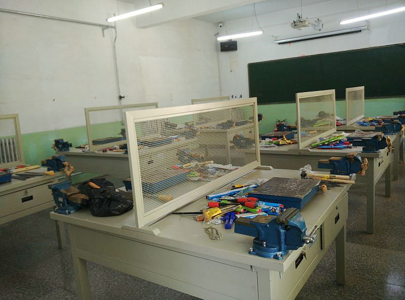 鉗工實訓室是為了配合技校、職業(yè)學校、勞動培訓中心、大中專院校課程中的技能訓練要求,從產(chǎn)品的安全保障、學教管系統(tǒng)配套、標準化生產(chǎn)、成熟可靠性、運輸安裝組合等多方面出發(fā),精心設計而成。 鉗工桌及貨架采用了鋼質(zhì)組合式拆裝結構,利于運輸安裝及適應于各種不同實訓場地。同時采用了磷化噴塑工藝,經(jīng)久耐用。通過鉗工工作臺可以使學生熟悉各種工具的使用;掌握錘、鋸、銼、鑿、劃線、測量等各種鉗工的基本技能;提高學生的鉗工工藝水平。