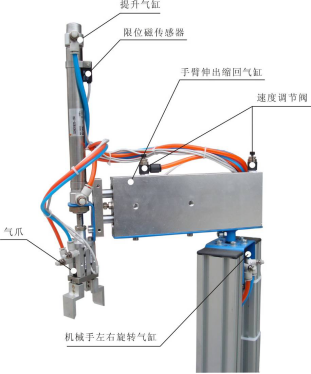 雙桿氣缸: 機械手臂伸出、縮回,由雙向電控氣閥控制。氣缸上裝有兩個磁性傳感器,檢測氣缸伸出或縮回位置。(接線注意 棕色接“+”、藍色接“-”)