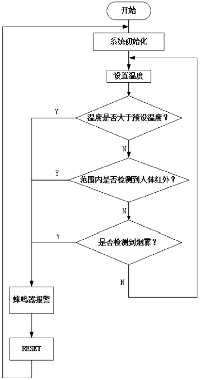 系統(tǒng)基于STC89C52RC單片機控制,采用C語言編寫程序,由3個傳感器:煙霧傳感器、紅外傳感器和溫度傳感器接收信號,由蜂鳴器輸出報警信號,LCD顯示輸出實時溫度和預(yù)設(shè)溫度。本系統(tǒng)在系統(tǒng)軟件控制下工作,HC-SR501人體紅外感應(yīng)模塊接受人體紅外輻射源的信號將所探測到的信號進行放大、濾波,并從這些信號中提取出信息觸動感應(yīng)開關(guān)電子模塊,將結(jié)果反饋給主控單片機STC89C52。DS18B20溫度采集器采集溫度信號傳送給可編程數(shù)字溫度計,對這些信號進行處理,若溫度高于警示溫度,則將信號反饋給主控單片機STC89C52。